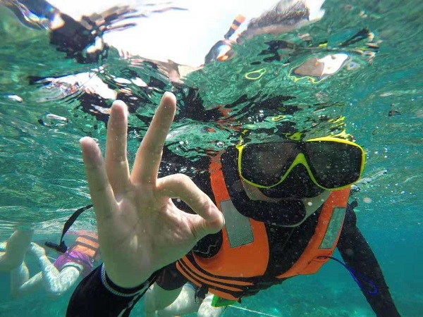 行程的重頭戲是跳海和浮潛。小伙伴們換好泳裝,登上快船出海啦,穿起救生衣,不管會不會游泳的都敢跳海。太陽當空照,我在海中泡。海水真的好咸,雖然天氣很熱,但泡在海水里溫度剛剛好,但久了鹽會滲進皮膚,有痛感,所以不宜多泡,泡久了可能就成“臘肉”了。下午的浮潛讓我很難忘,不是因為美景,而是因為我的手機也跟著一起泡進了海水,完全報廢。但這也影響不了我的好心情,海底世界的寬闊廣袤、豐富多彩,讓人飄著飄著就忘記了時間。雖然有手機“壯烈犧牲”的小插曲,但也滿足了我這個“海外”人士對海的絕大部分期望。